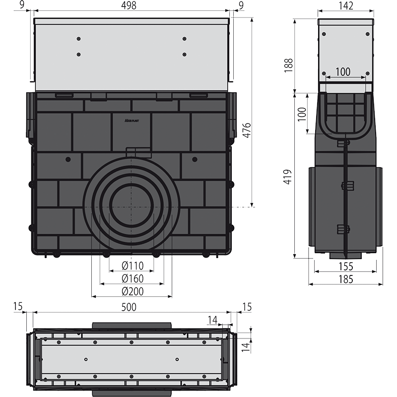 Siphon d’extérieur caniveau à fente avec cache d’accès asymétrique 160 mm, inox galvanisé