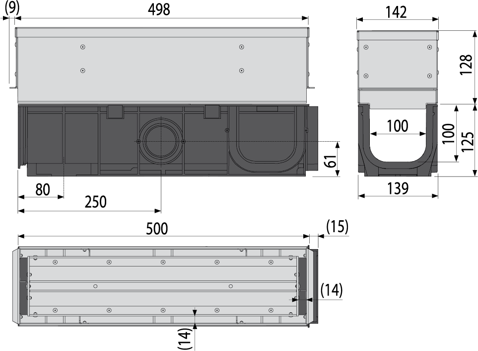 • Matériau du caniveau : polypropylène chargé de talc résistant aux dommages mécaniques, chimiques et thermiques