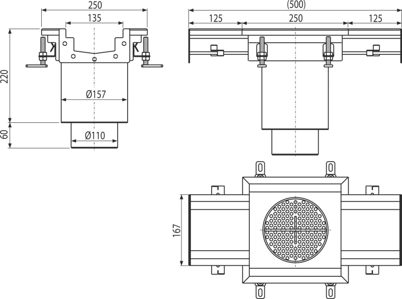 Siphon de sol box industriel intermédiaire 250×250-135, inox AISI 304