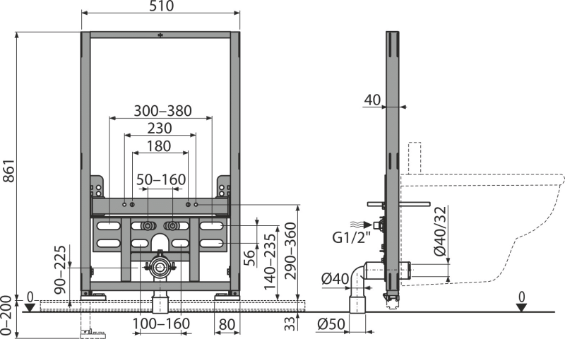 - Pour bidet suspendu avec entraxe de raccordement de 180 mm ou 230 mm