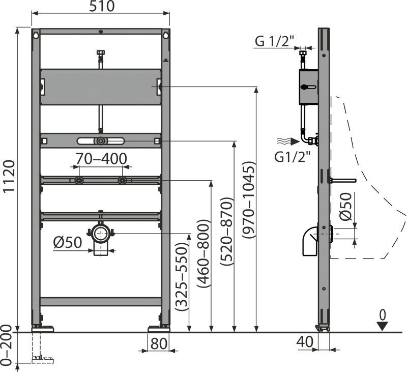 - Espacement des fixations urinoir 80–280 mm