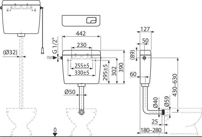 Lors de l’installation sur un réservoir surélevé, seule la grande chasse d’eau est fonctionnelle6 – 8 l