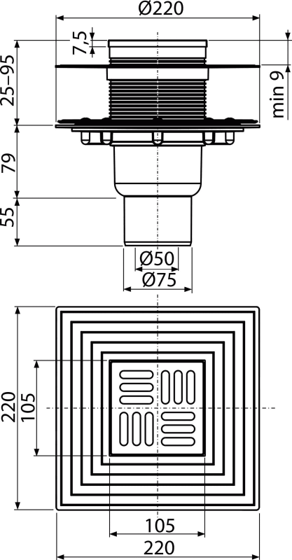 Siphon de sol 105×105/50/75 mm sortie verticale, grille inox, bride en inox, collier d'isolation de 2ème niveau, siphon anti-odeur et clapet SMART