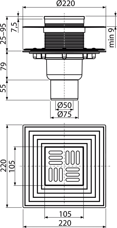 Siphon de sol 105×105/50/75 mm sortie verticale, grille inox, bride en inox, collier d'isolation de 2ème niveau,siphon anti-odeur et clapet