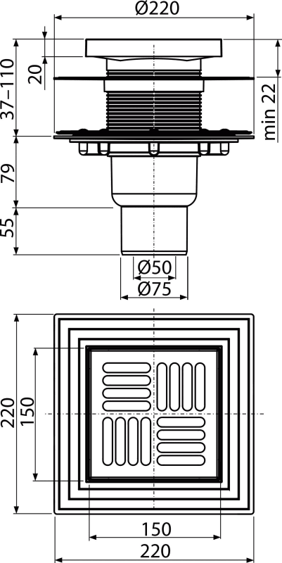 Siphon de sol 150×150/50/75 mm sortie verticale, grille inox, bride en inox, collier d'isolation de 2ème niveau, siphon anti-odeur et clapet