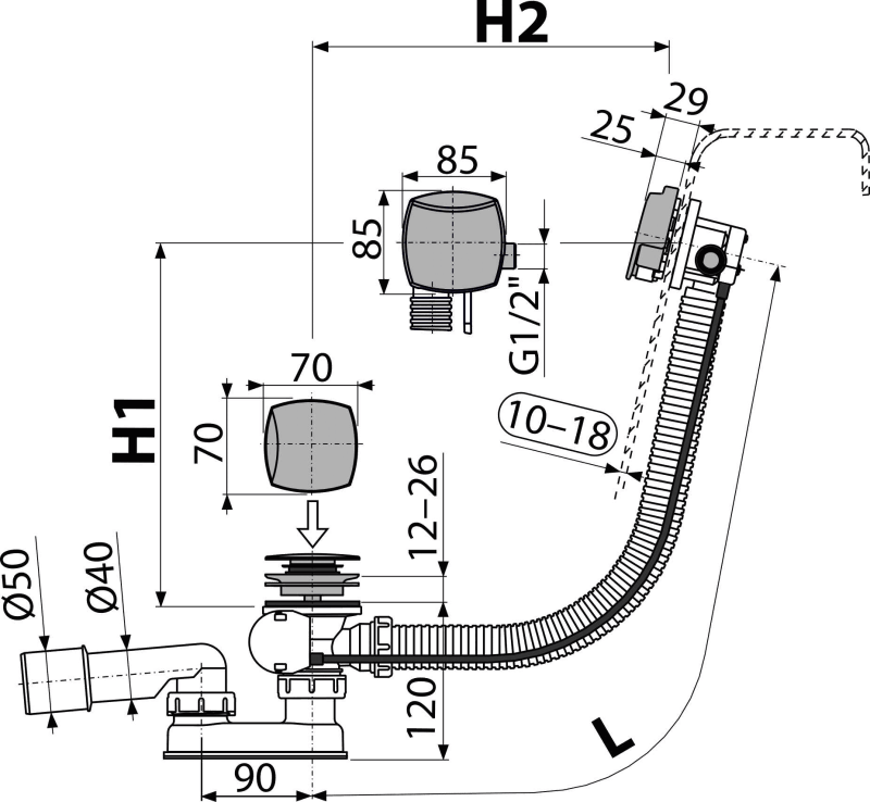 Siphon de baignoire automatique avec remplissage de trop-plein pour baignoires à parois épaisses, métal