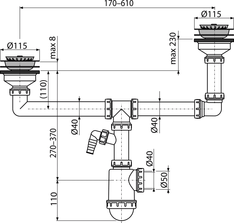 - Sortie d’évacuation préparée pour le raccordement d’un tube d’évacuation de Ø 50 ou Ø 40 mm.
