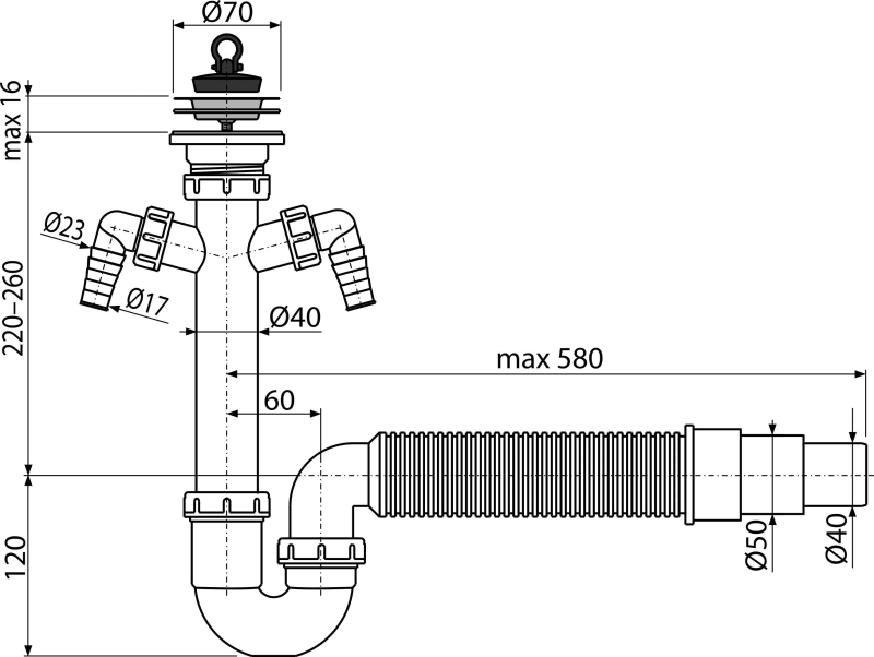 Siphon tubulaire avec panier inox DN70, deux raccords et flexible d'évacuation